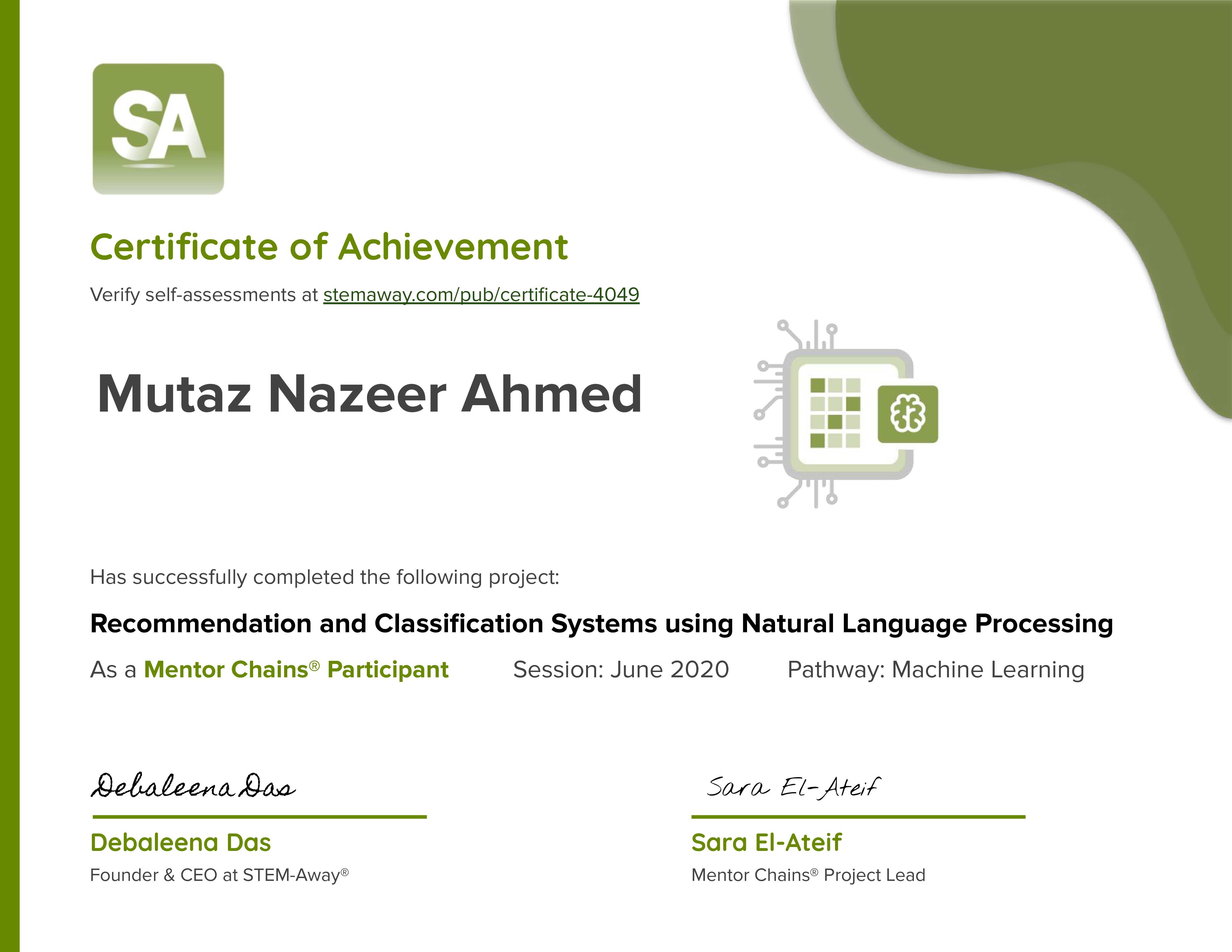 Certificate 4049 for Mutaz Nazeer Ahmed